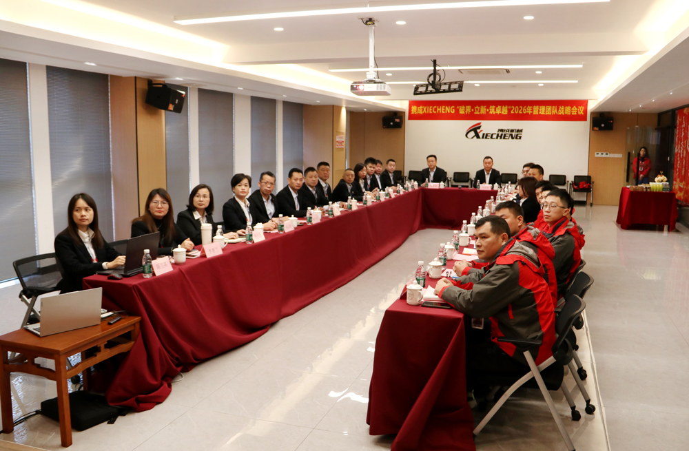 El 24 de enero de 2026, XIECHENG Intelligent Equipment celebró su conferencia anual de estrategia de gestión en la sede de la empresa bajo el tema "Avance · Innovación · Excelencia". La reunión reunió al Gerente General, Sr. Fu Zhibo, a la Directora de Marketing, Sra. Tan Yinxiang, al Subdirector General de Fabricación, Sr. Lu Xiaoxing, y a gerentes clave de todos los departamentos para revisar el año 2025 y delinear la hoja de ruta estratégica para 2026.